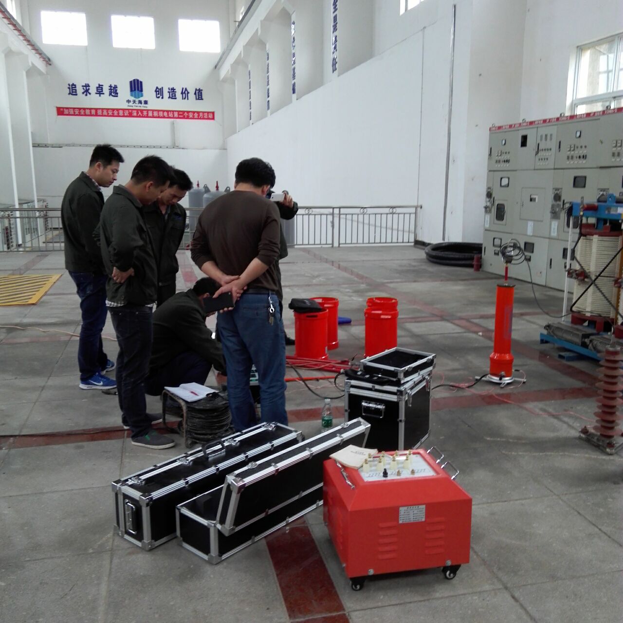 此次培訓(xùn)的重點設(shè)備是YTC850-135kVA/108kV變頻串聯(lián)諧振試驗裝置。我公司的該設(shè)備為專利產(chǎn)品,諧振電源調(diào)頻及功率元件使用先進的日本進口的優(yōu)質(zhì)元器件,設(shè)計的是諧振式濾波電路,能改善輸出電壓的波形畸變,獲得很好的正弦波形,有效的防止了諧波峰值對試品的誤擊穿。變頻電源保護功能強,穩(wěn)定性好;具備具備全自動(自動調(diào)諧、自動升壓)、全手動(手動調(diào)諧、手動升壓)以及半自動(自動調(diào)諧、手動升壓及手動調(diào)諧、自動升壓)的多種工作模式,可任意切換使用;操作方便;采用220V或380V單相電源,方便現(xiàn)場取電。