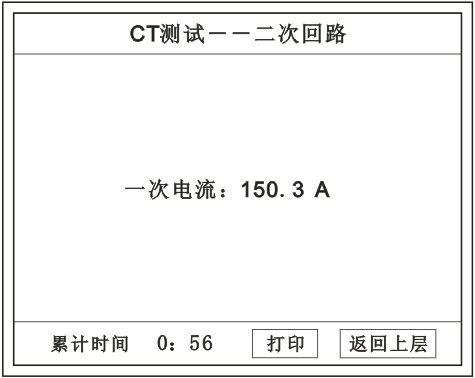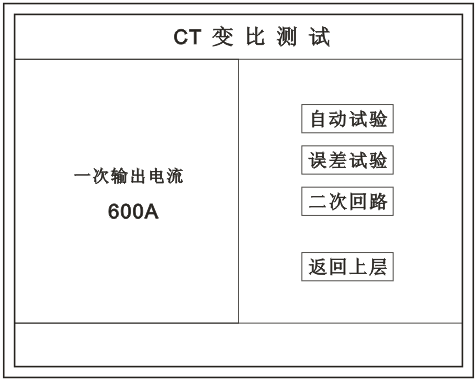 在主菜單界面,旋轉鼠標將光標移動到  CT測試  選項上,按下旋轉鼠標選擇 CT變比 即可進入變比極性試驗設置界面(如下圖)。光標移動至  返回上層  ,按下鼠標即可返回主菜單。