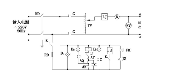 其中JS:時間繼電器   TY:自藕調壓器     FM:報警器  LJ:過流繼電器    D1、D2、D3:指示燈  C:交流接觸器   RD:熔斷器   K:總電源開關   K1:時間繼電器電源開關 AK:調壓器回零限位開關  AQ:起動按鈕   CL:高壓硅堆   AT:停止按鈕  A:輸出電流表    KV:輸出電壓表