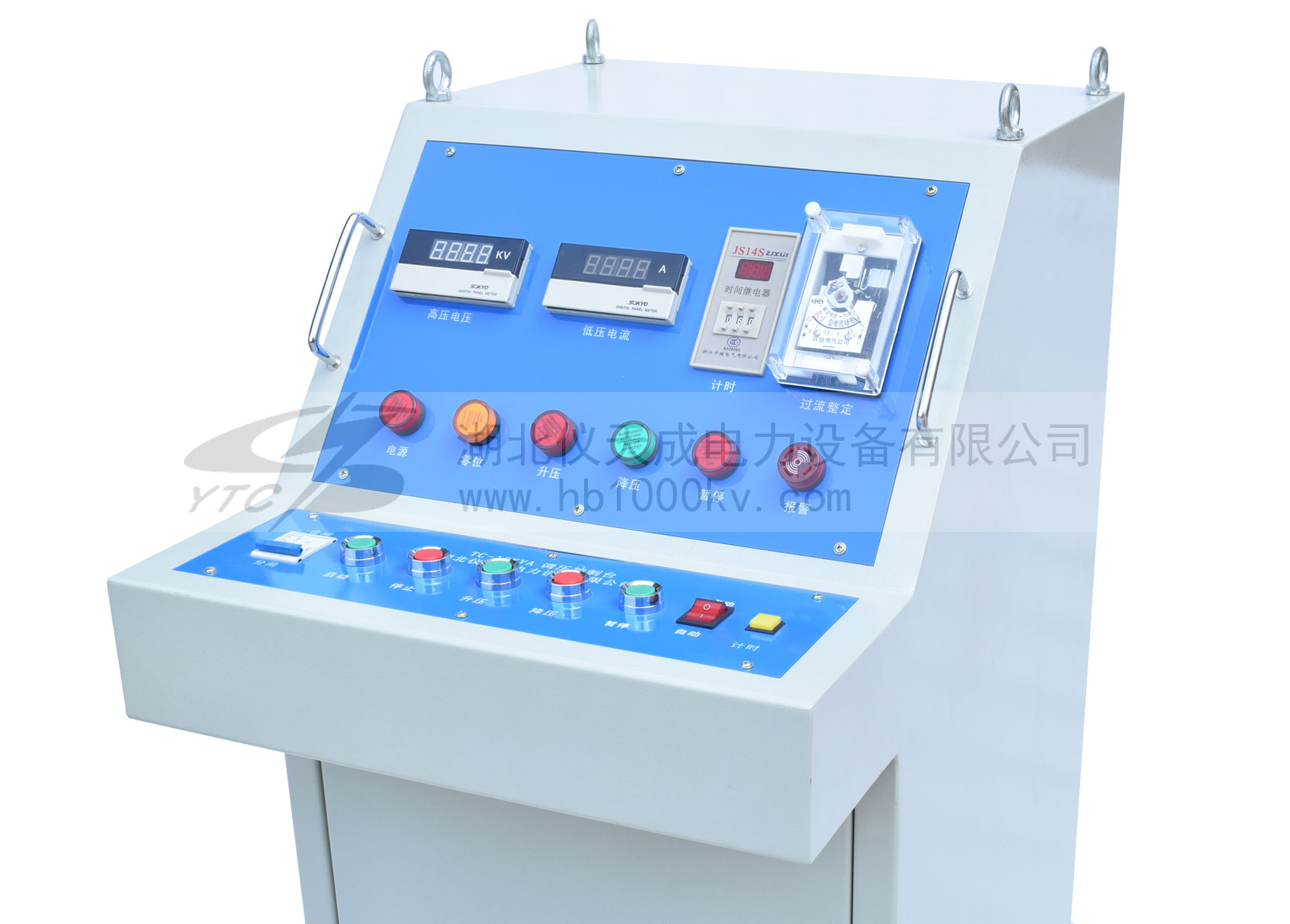 把電源輸入有過流自動脫扣及防止突發加壓的零位連鎖裝置的操作箱,經自耦調壓器調節電壓輸入YDQ充氣式試驗變壓器初級繞組,根據電磁感應原理,在次級(高壓)繞組按其與初級繞組匝數之比可獲得同等倍數的電壓幅值-工頻高壓。